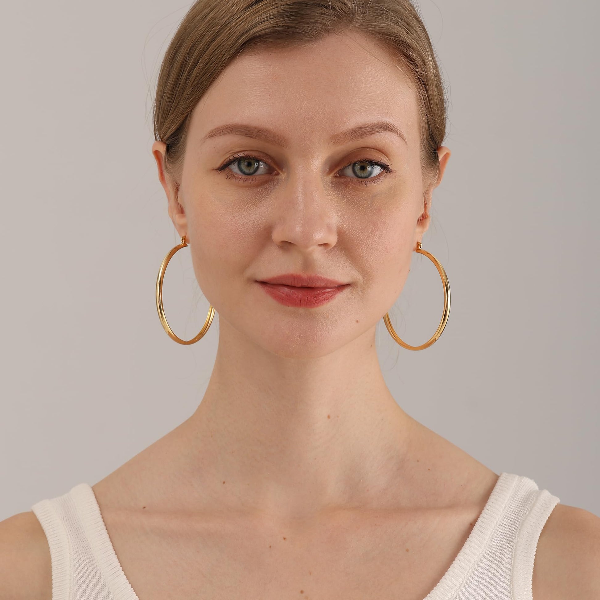- Big Gold Hoop Earrings Size:Women's hoop earrings have many sizes for you to choose,You can choose size 20mm-60mm to meet your different outfits demands. Classic Round Hoop Earrings will catch your audience's eyes even you have long hair,which will keep shining for a long time.