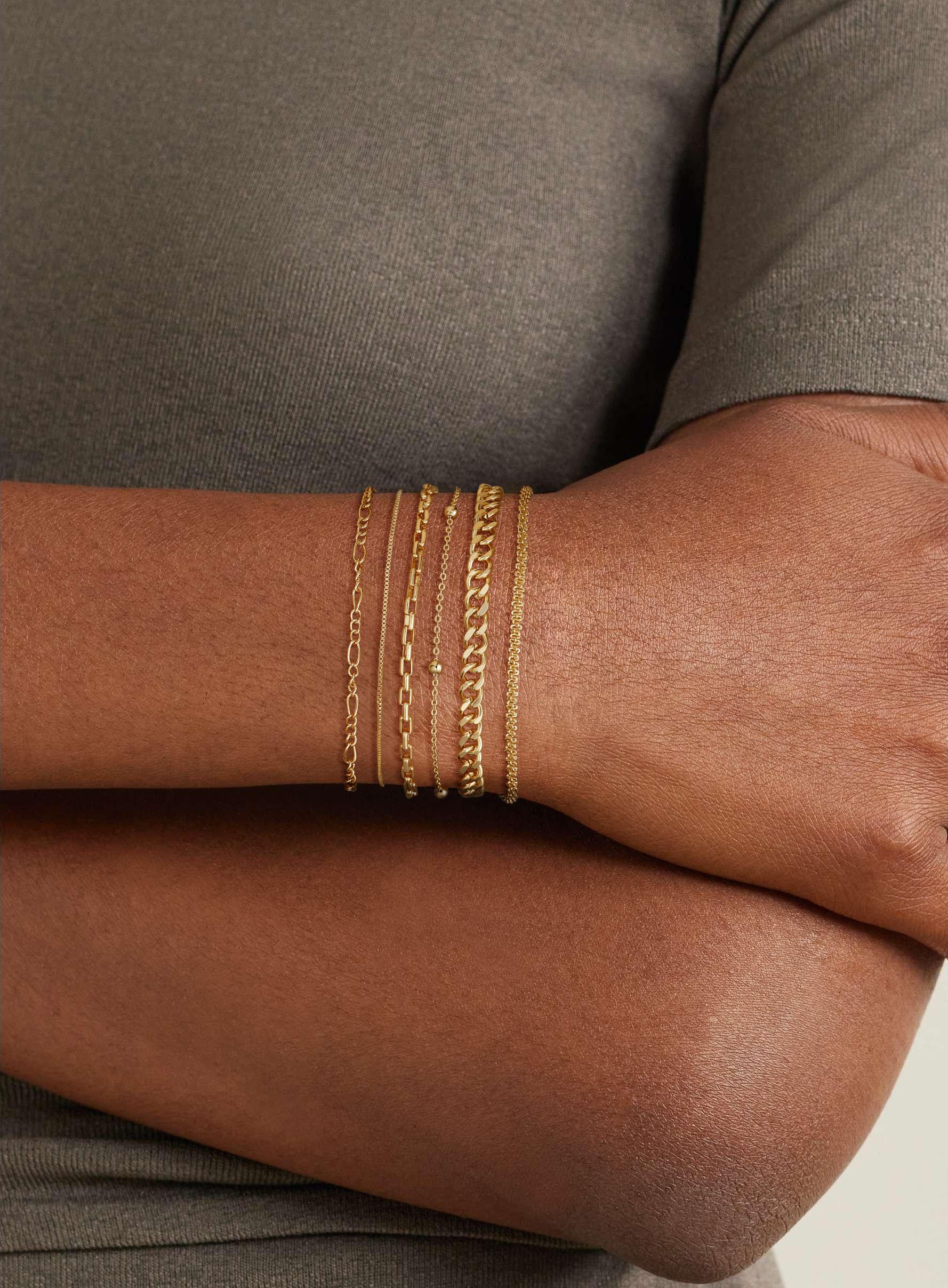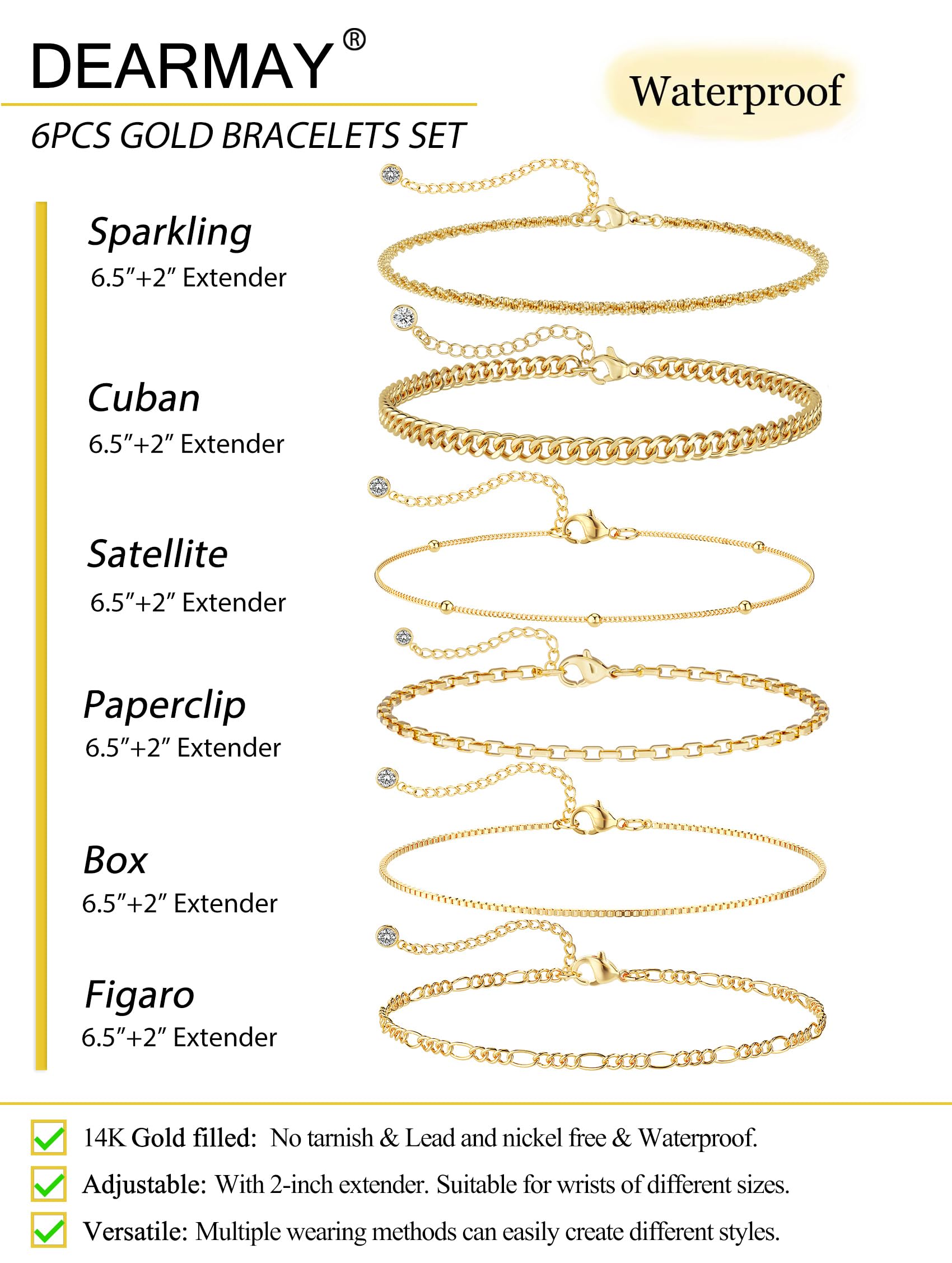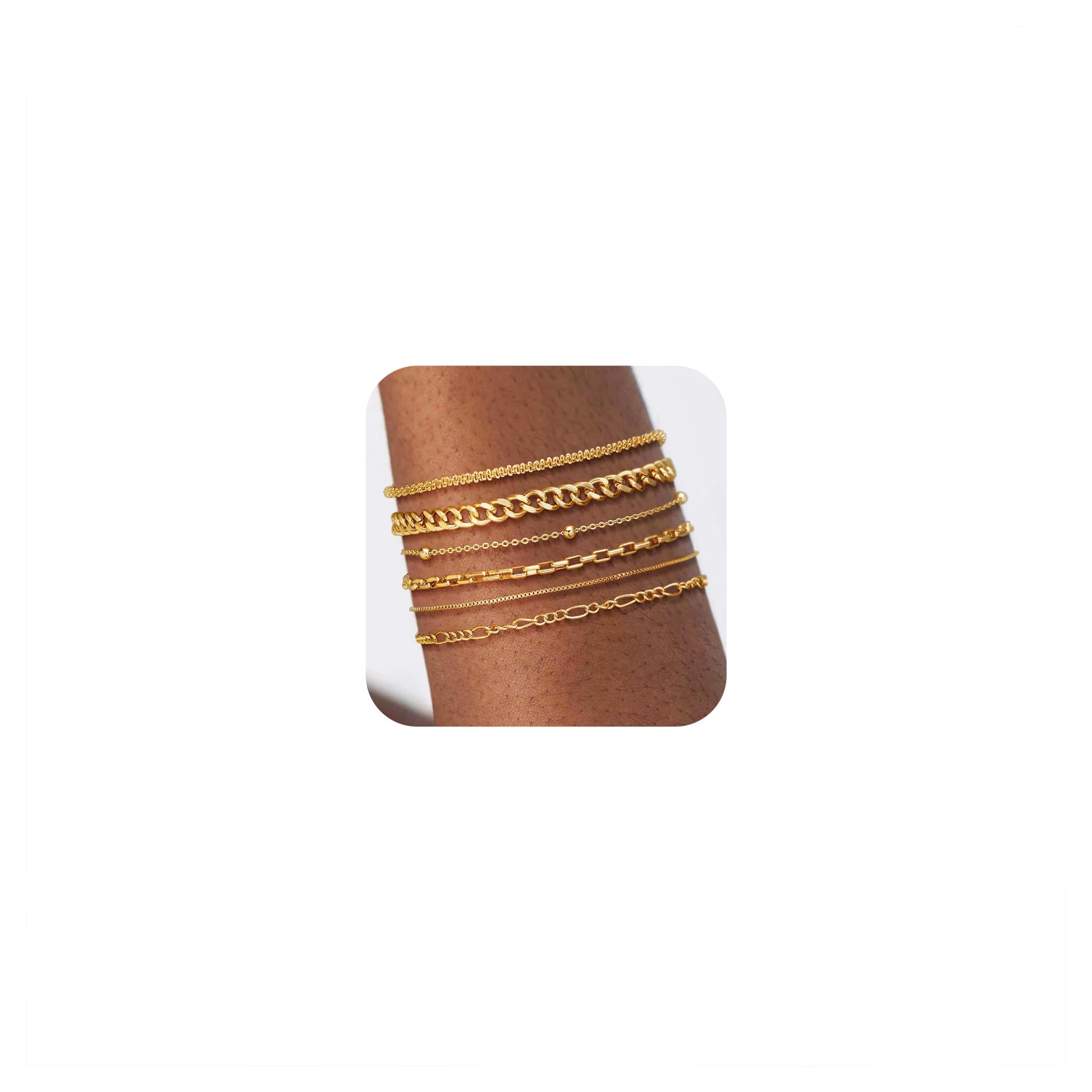 - 👜 【6Pcs GOLD BRACELETS SET】:Set contains: ①Cuban Link Bracelets ②Sparkling Chain Bracelets ③Box Chain Bracelets ④Paperclip Bracelets ⑤Figaro Bracelets ⑥Satellite Bracelets. These Bracelets are suitable for layering as well as being worn alone.