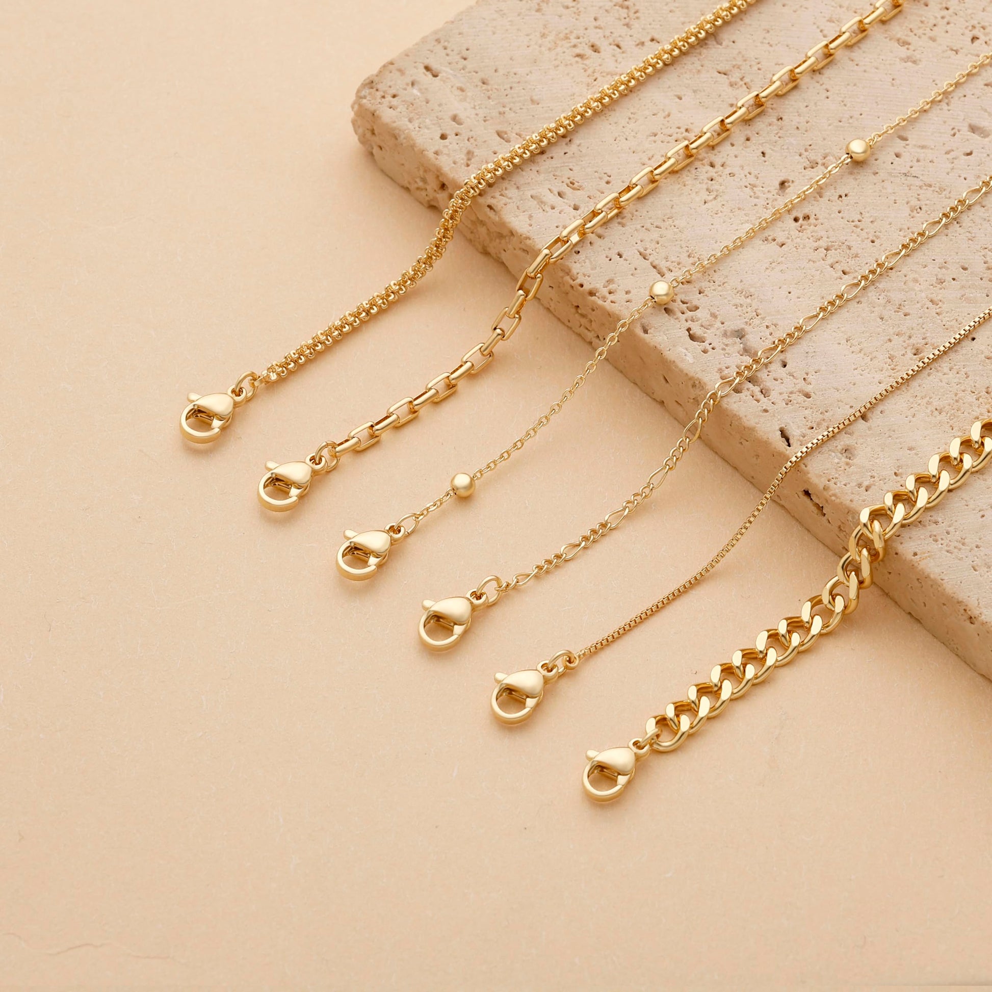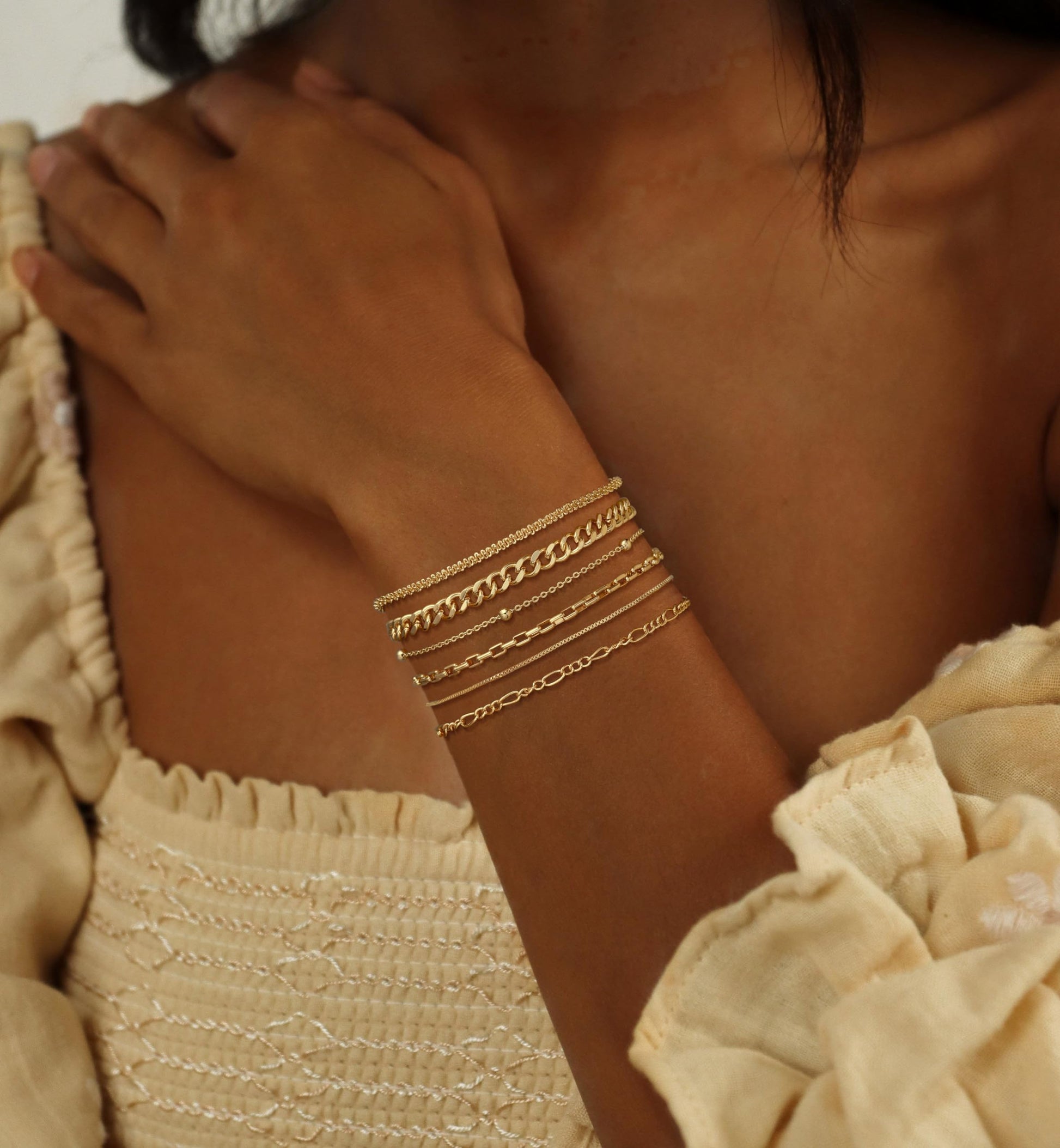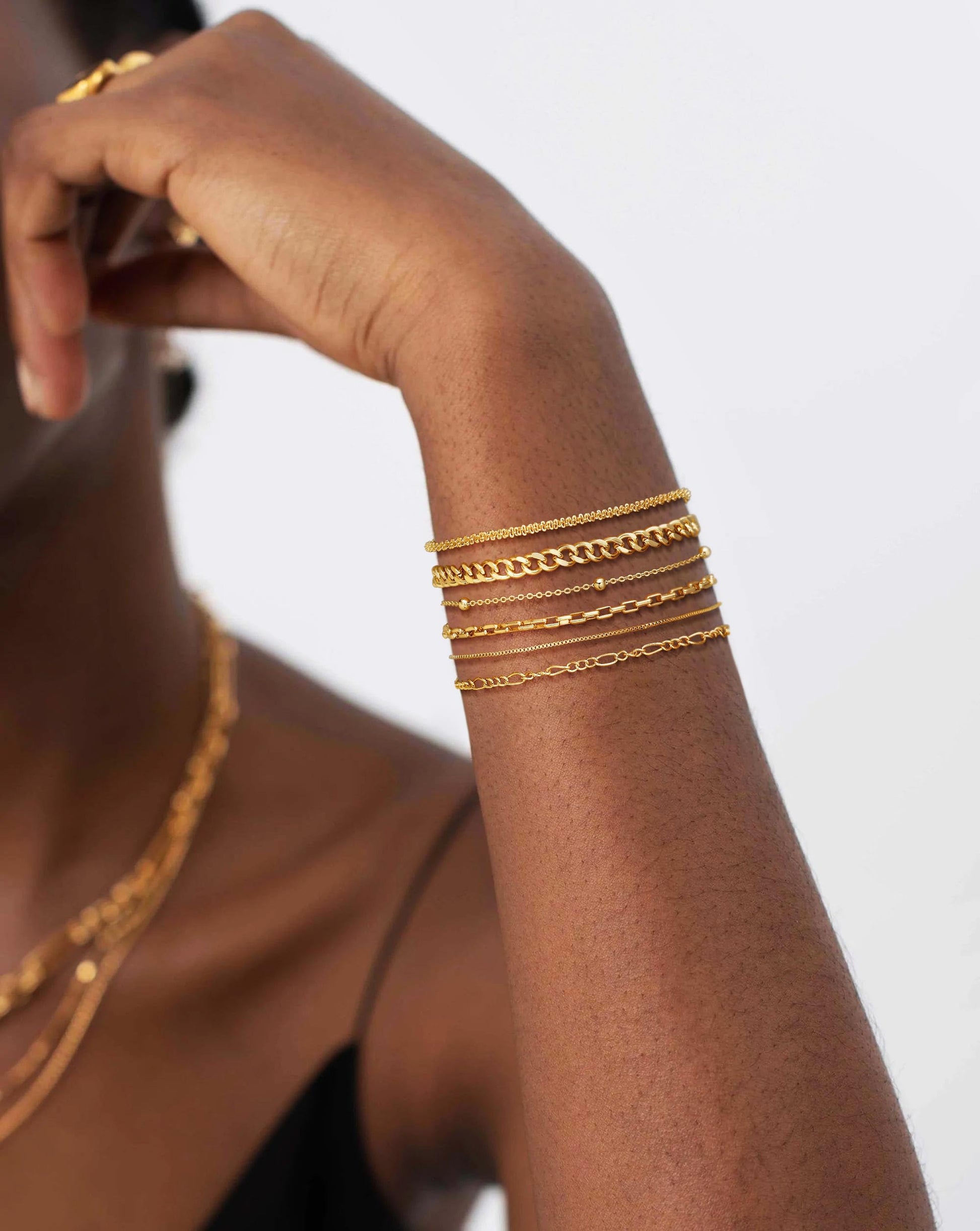 - 👜 【6Pcs GOLD BRACELETS SET】:Set contains: ①Cuban Link Bracelets ②Sparkling Chain Bracelets ③Box Chain Bracelets ④Paperclip Bracelets ⑤Figaro Bracelets ⑥Satellite Bracelets. These Bracelets are suitable for layering as well as being worn alone.