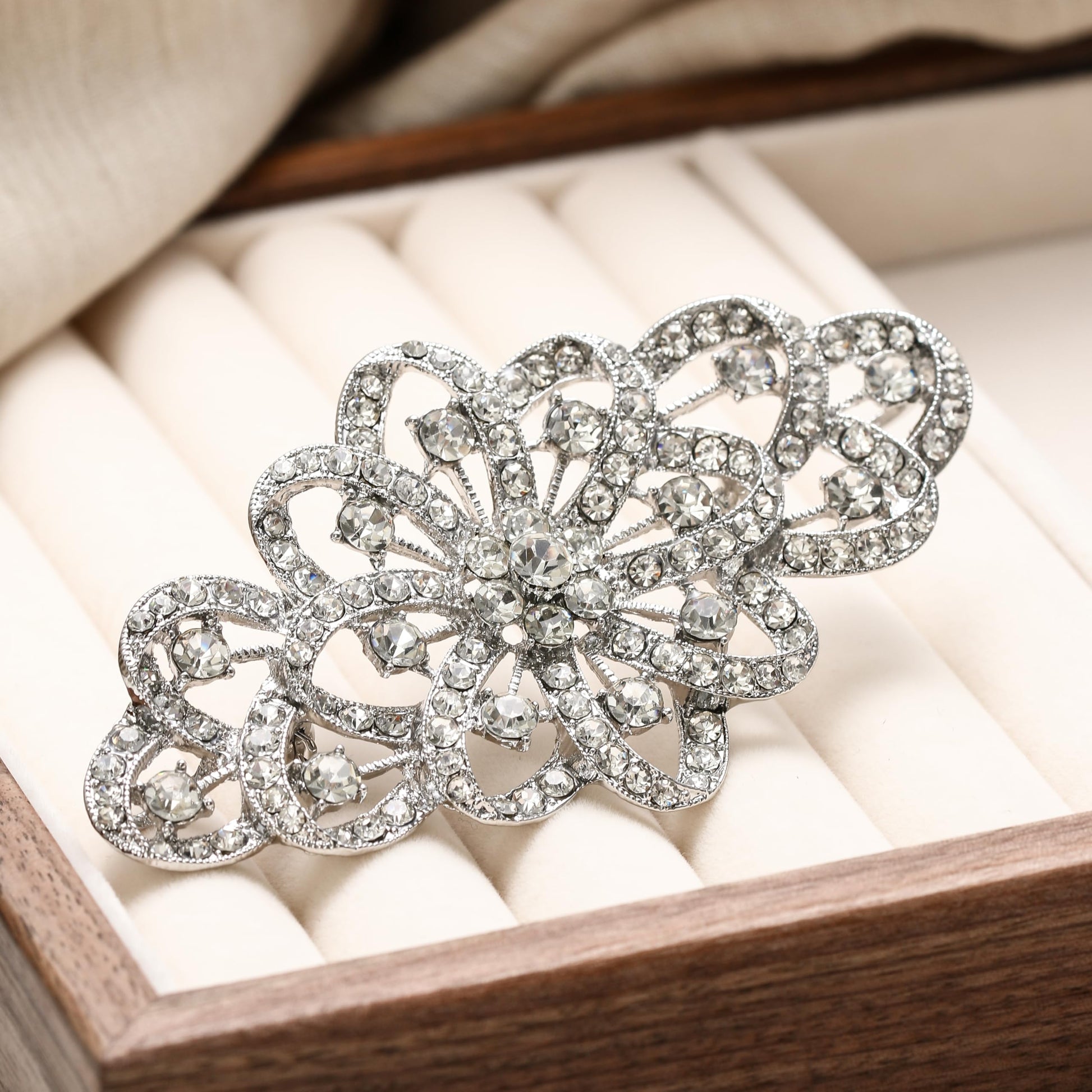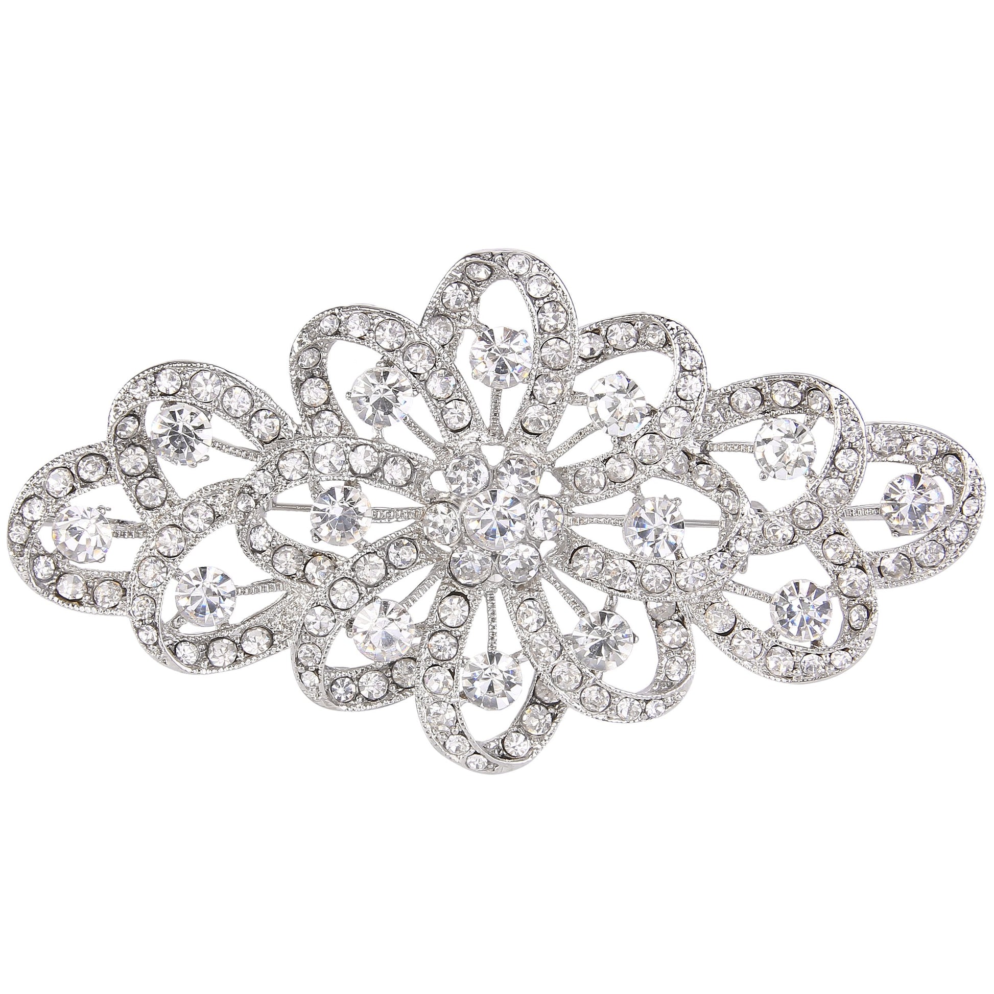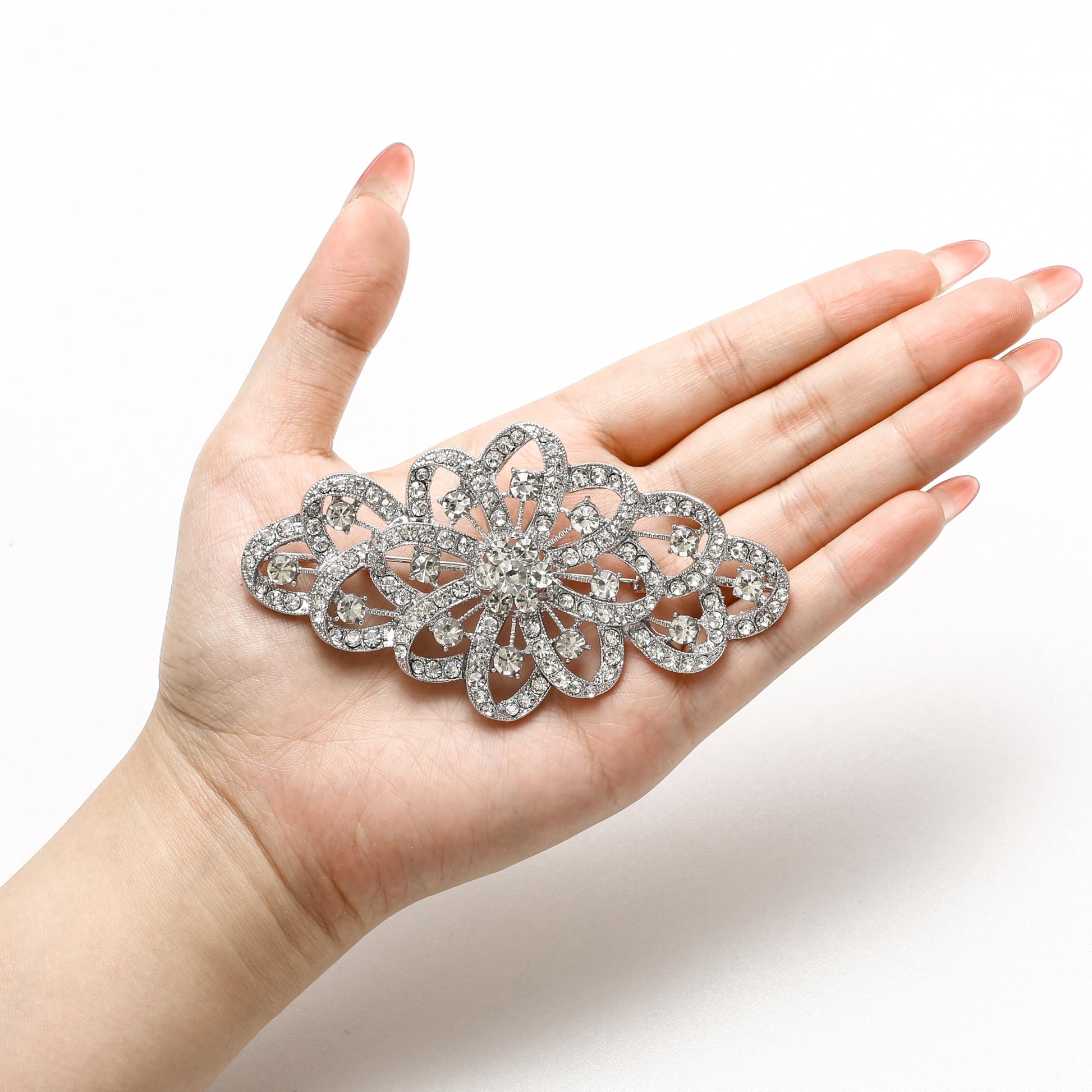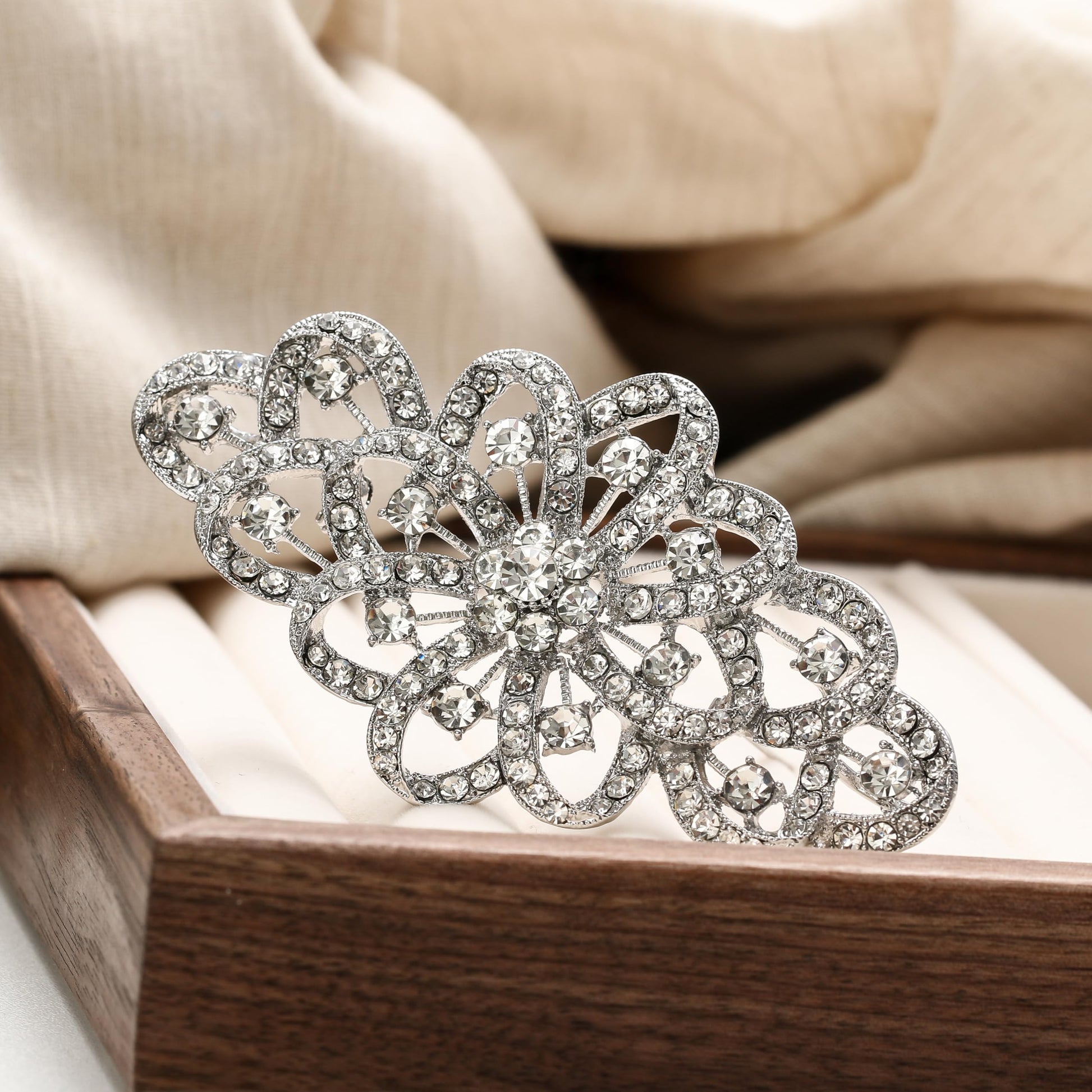 - This large brooch is made of crystals and alloy. Wearing a strapless dinner dress, formal gown or casual wear, matching this brooch, it will make you more eye-catching in wedding ceremony, reception, party, dance and other gorgeous events.