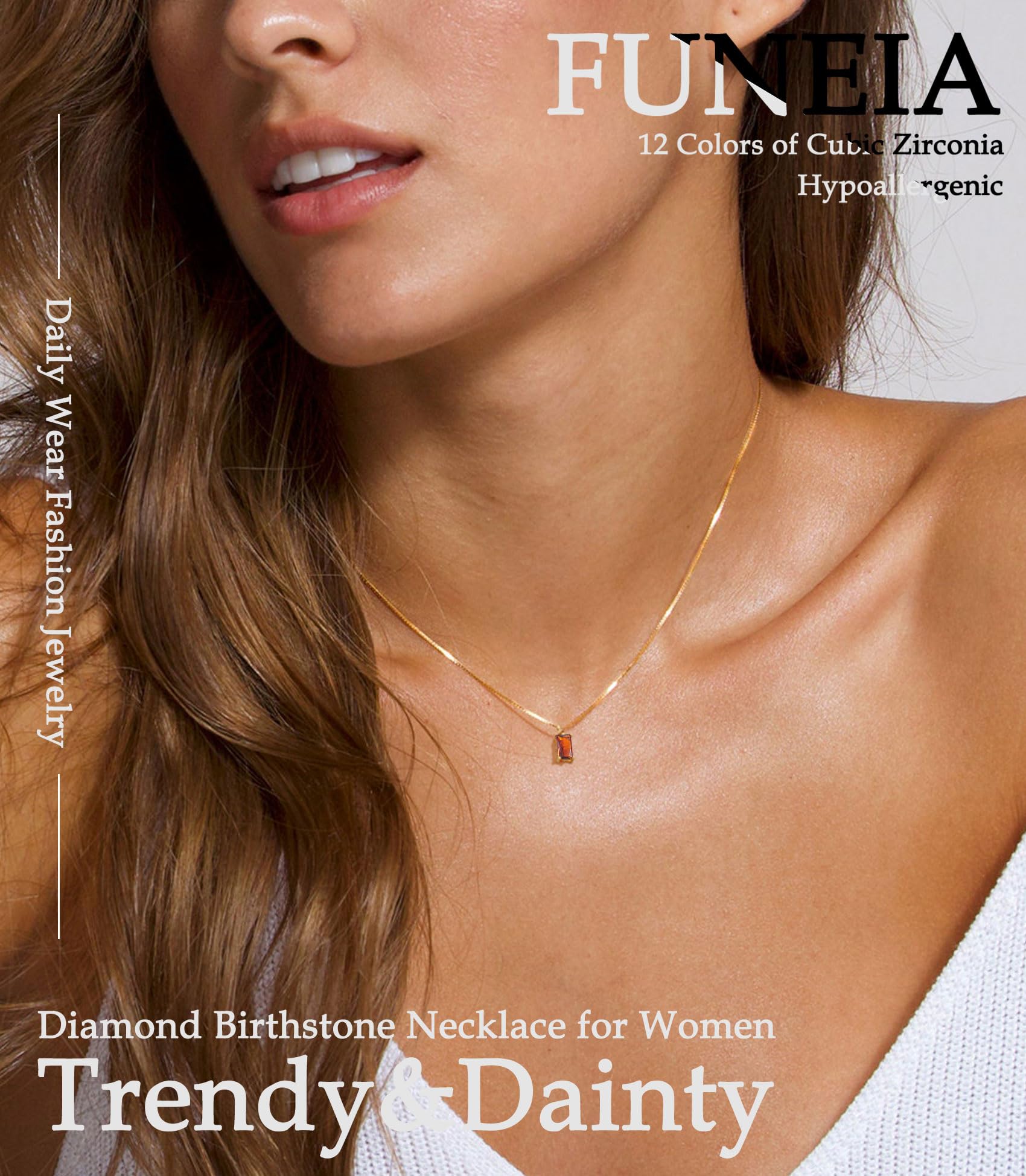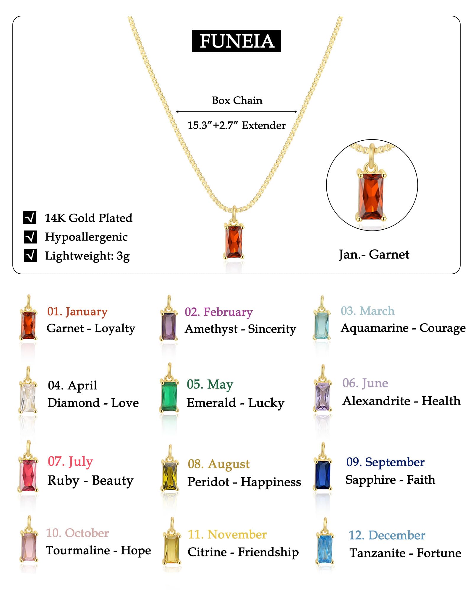- 14K GOLD PLATED NECKLACE: The birthstone necklace consists of 12 colors of cubic zirconia(0.4cm*0.8cm) and 14K gold plated box chain without nickle and lead, hypoallergenic. Generous and simple designs will never go out of style