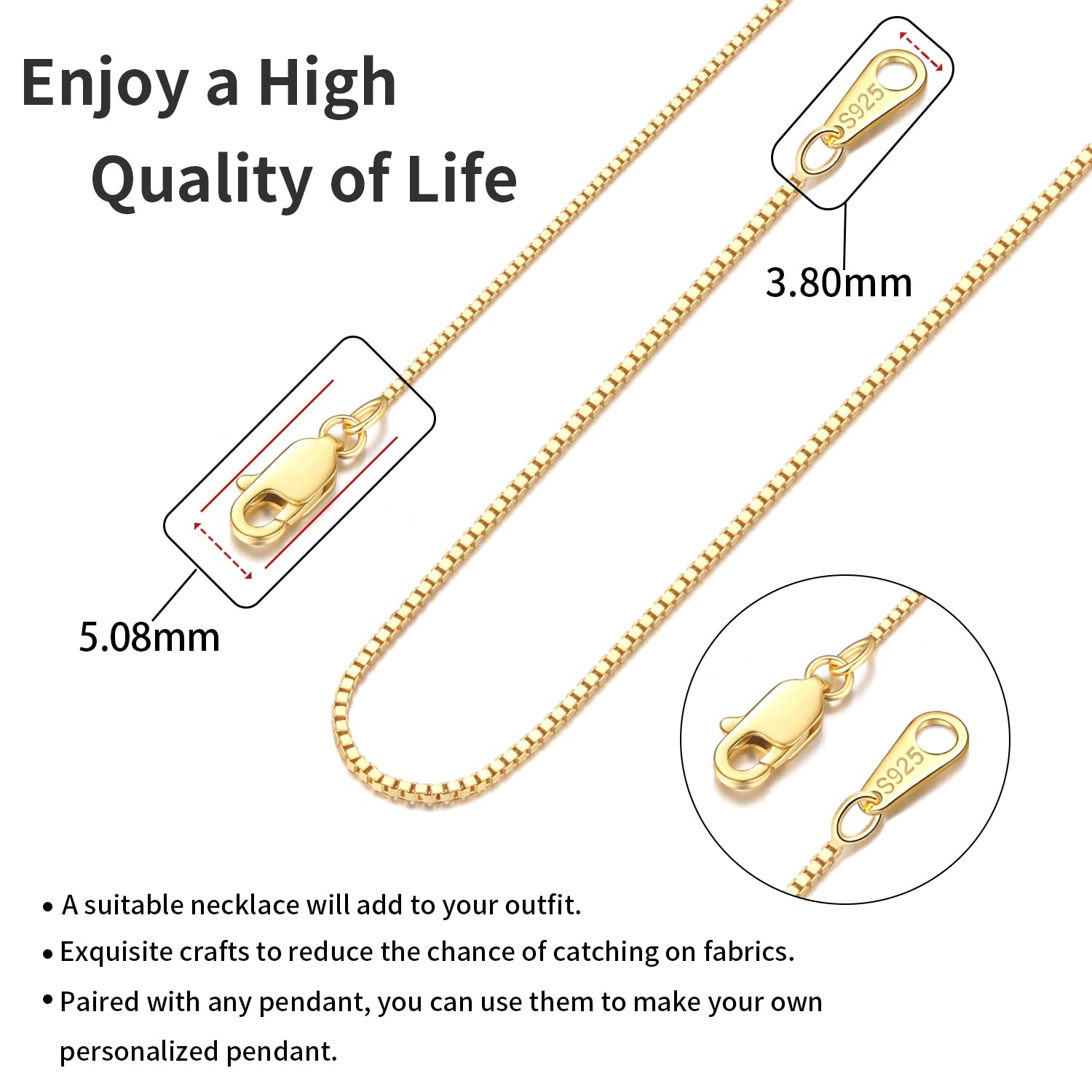 - Bright Luster Forever: Featuring advanced multi-electroplating technology with 18K gold plated, to ensure this 18k gold plated chain necklace won’t change colors and last its beauty for a long time. Exclusive bright 18k gold color plating and exquisite craftsmenship, to ensure this box chain shiny and sparkles from any angles.