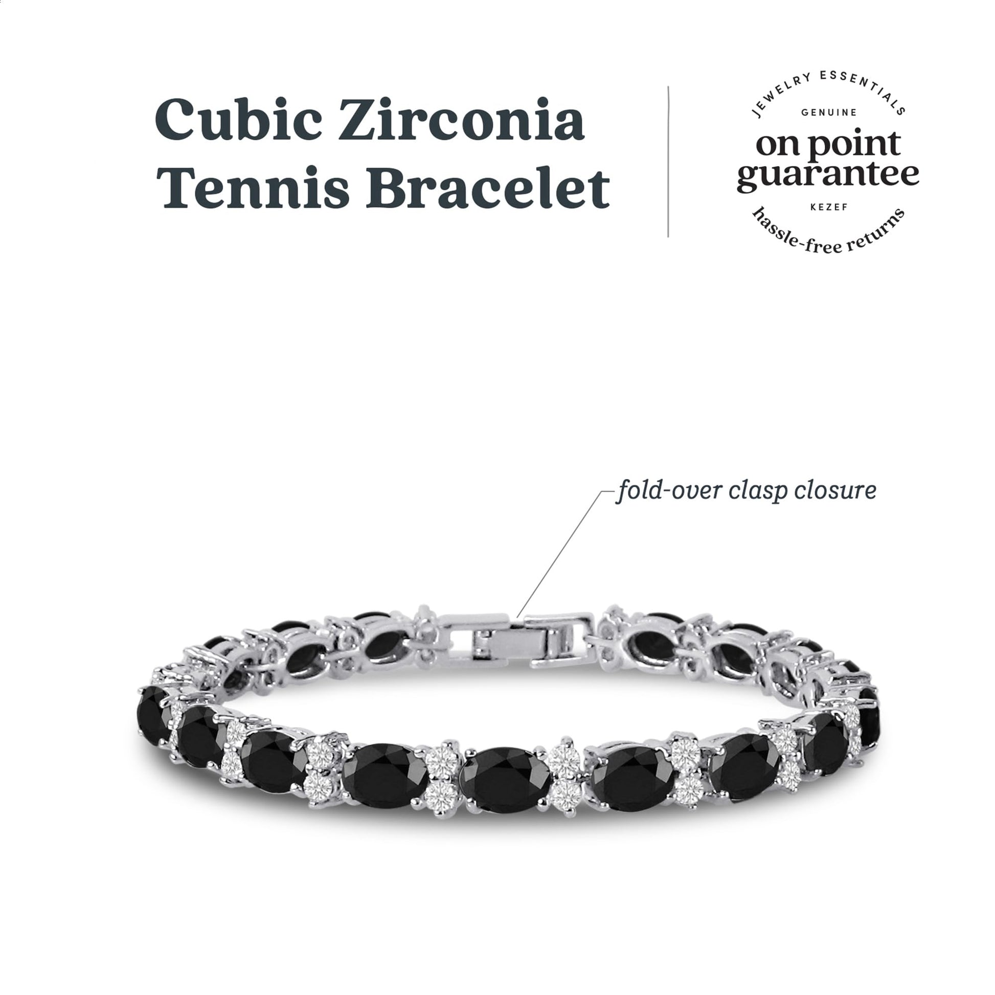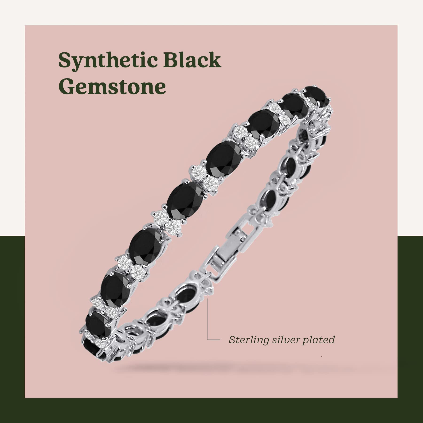 - SPECIFICATIONS OF CZ TENNIS BRACELETS FOR WOMEN: Cubic Zirconia round complimented by oval cut Black simulated gemstone; set in silver plated brass; hypoallergenic; 7” length.