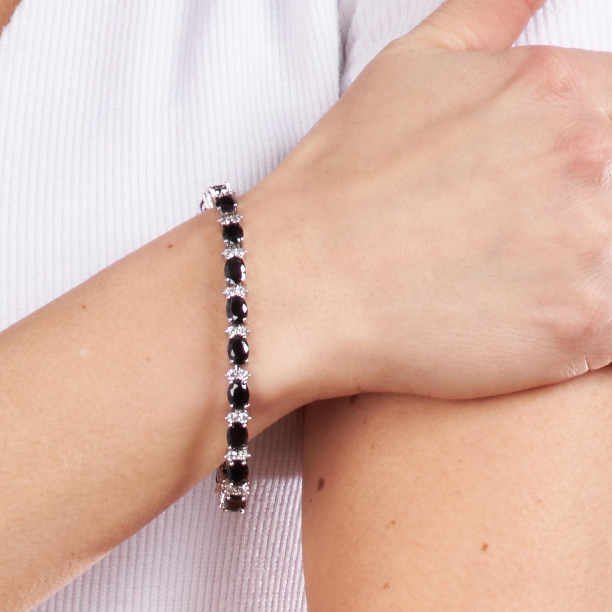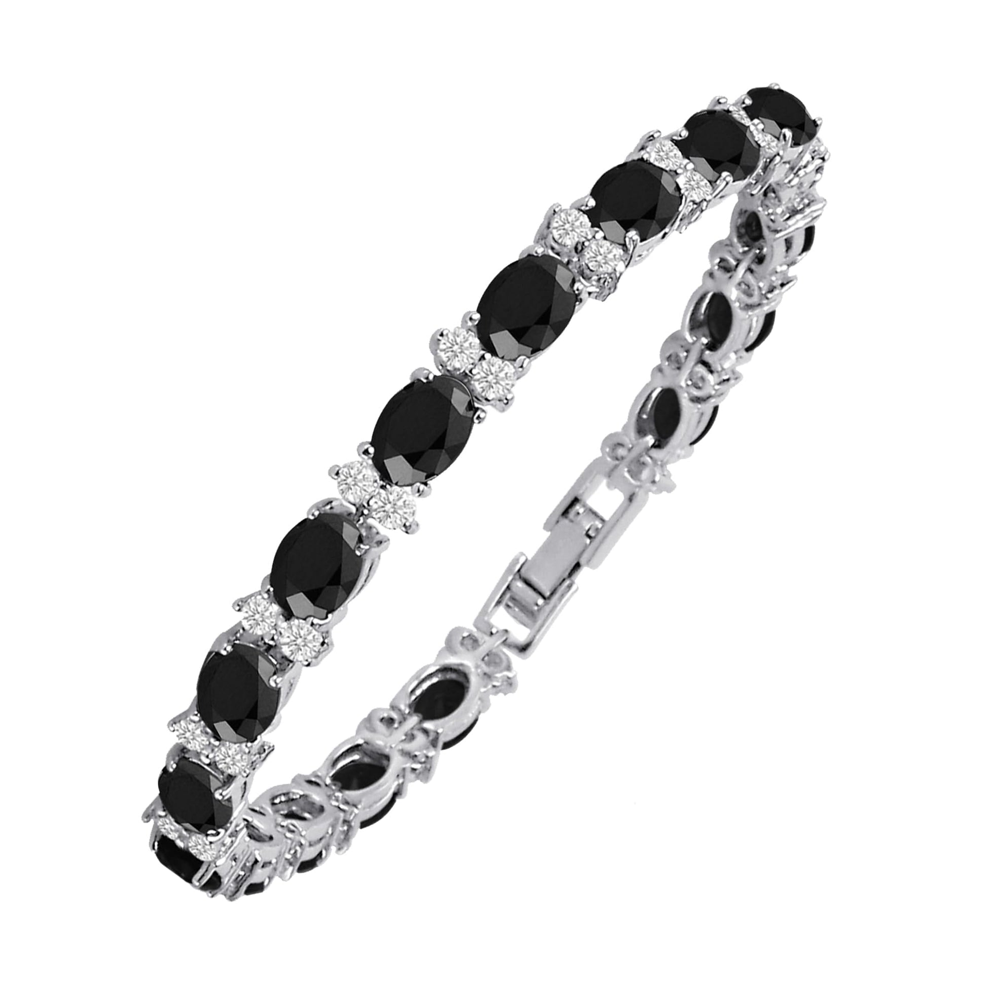 - AFFORDABLE CUBIC ZIRCONIA TENNIS BRACELET WITH DIAMOND-LIKE BRILLIANCE: With gorgeous White Round CZ, Oval Cut simulated Black Gemstones accentuated by Silver Plated Brass, this Tennis Bracelet will add a diamond-like brilliance to any outfits; go on, enjoy the radiance of CZ and simulated gemstones at only a fraction of the price of real diamonds and precious stones.