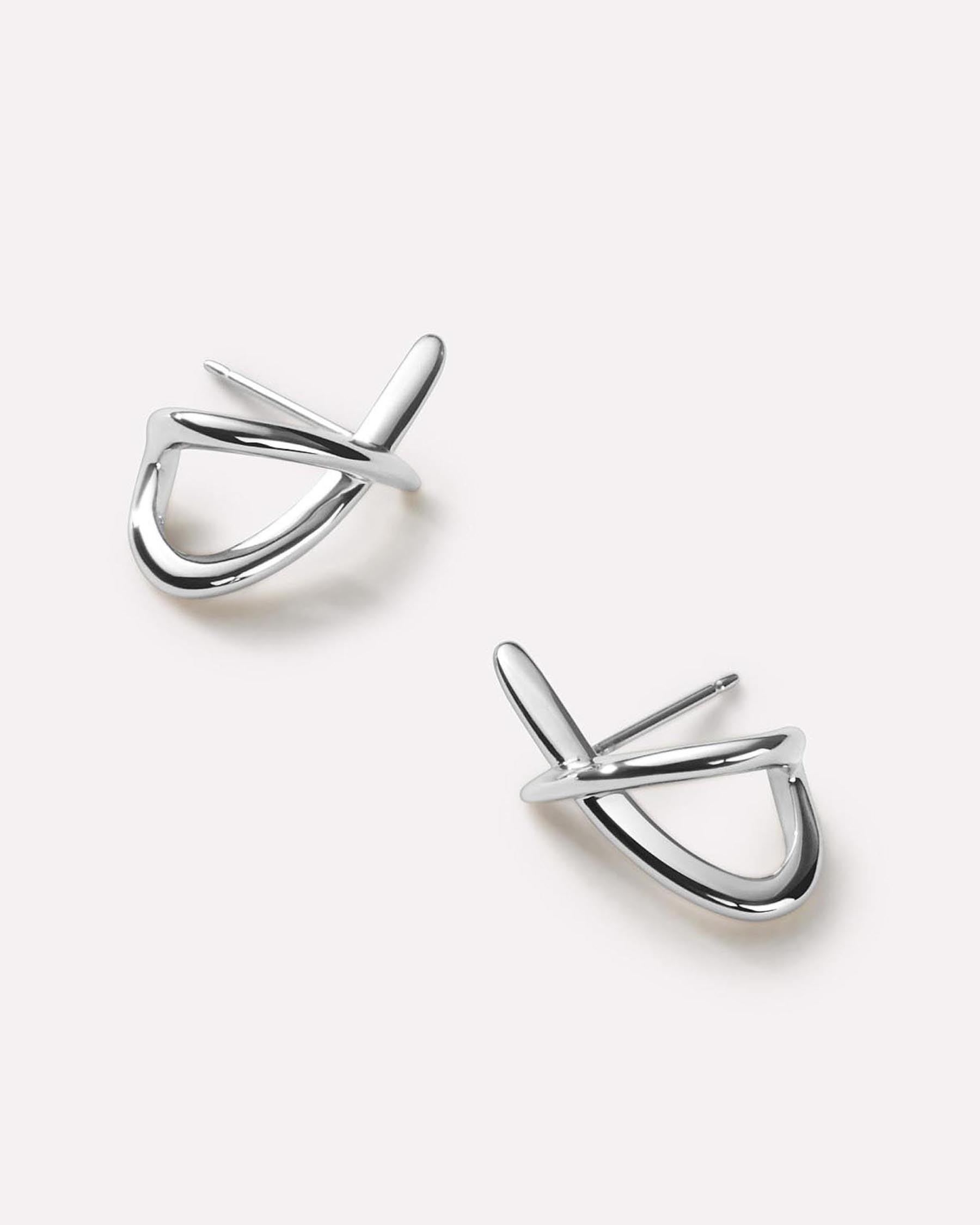 - Silver Earrings:These silver stud earrings are the elevated staple your collection needs. Their criss-cross design adds a little something extra that makes them stand out. Wear them on their own or pair them with our Mini Huggie Hoops for a stacked look.