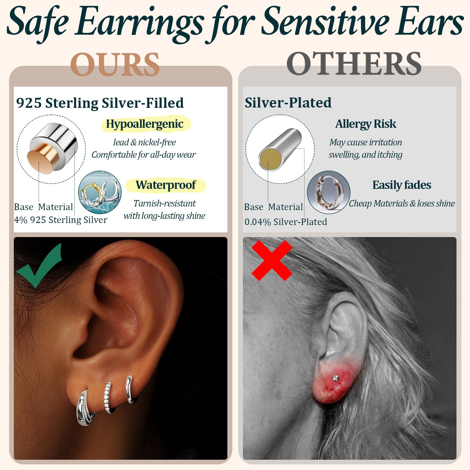 - [Dainty Earrings Set] We feature the perfect mix of hoop earrings, thoughtfully designed as a silver earring set ideal for multiple piercings. These three pairs of small hoop earrings for women can be worn individually or stacked to create a stylish, layered look that reflects your unique style