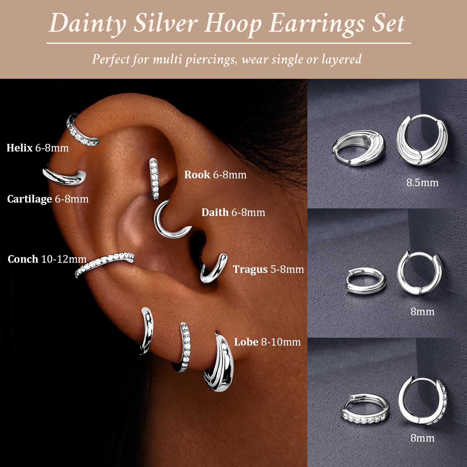 - [Ideal Size] The silver hoop earrings and cubic zirconia huggies both have an 8mm inner diameter, while the ribbed silver hoops measure 9mm. These beautifully crafted small silver hoops are a chic accessory that complements any outfit and are perfect for trendy cartilage or helix piercings