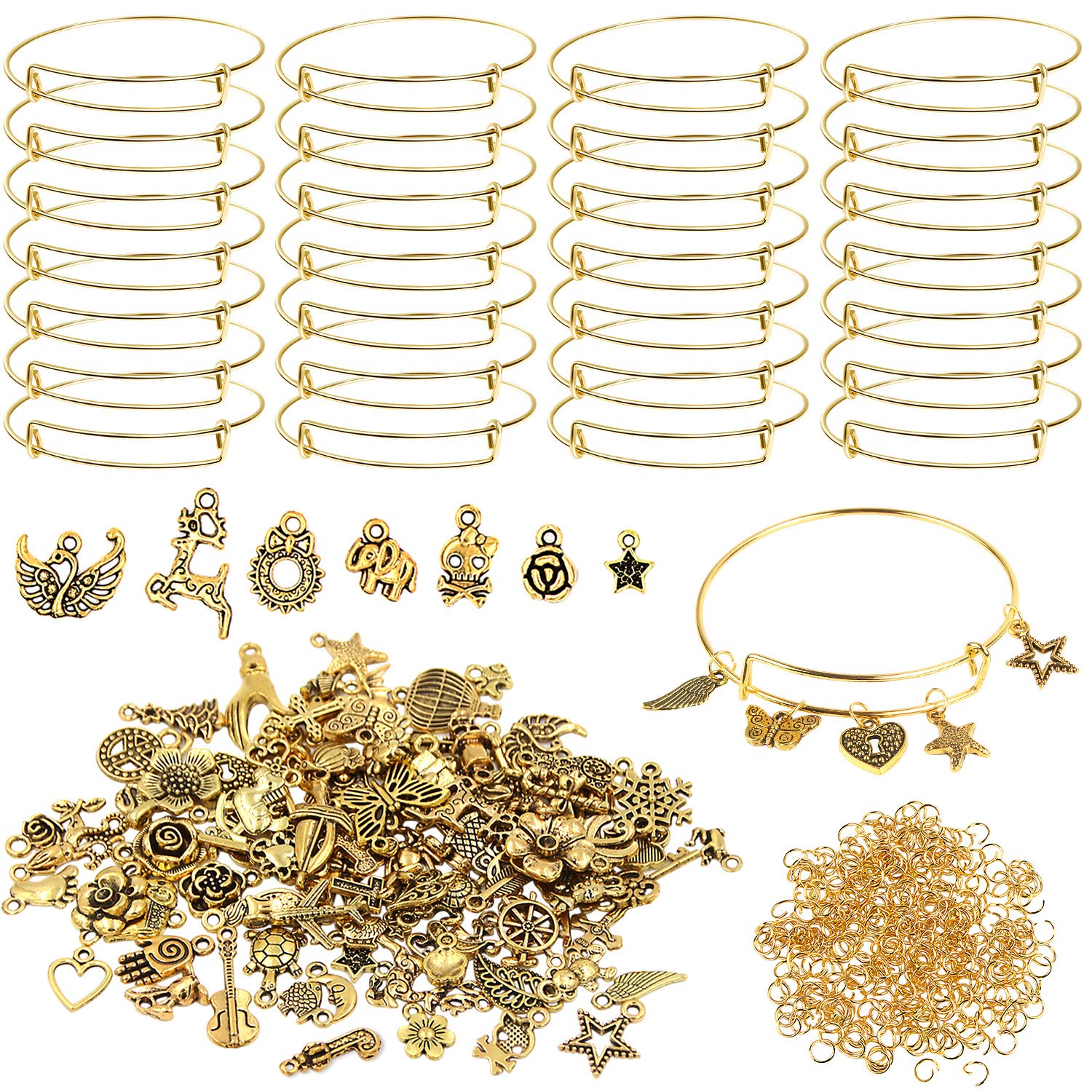 - Value Kit- Set includes 30 pcs gold expandable blank bracelets, 100pcs tibetan antique gold charms, 200pcs gold open jump rings. Value packs for DIY lovers.